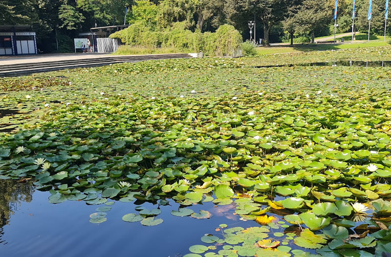 El parque está repleto de hermosos parterres, fuentes, gansos, diversas especies de aves y fauna silvestre. Un lugar ideal para practicar senderismo, montar en bicicleta o simplemente disfrutar de la serenidad de la naturaleza en un banco del parque.